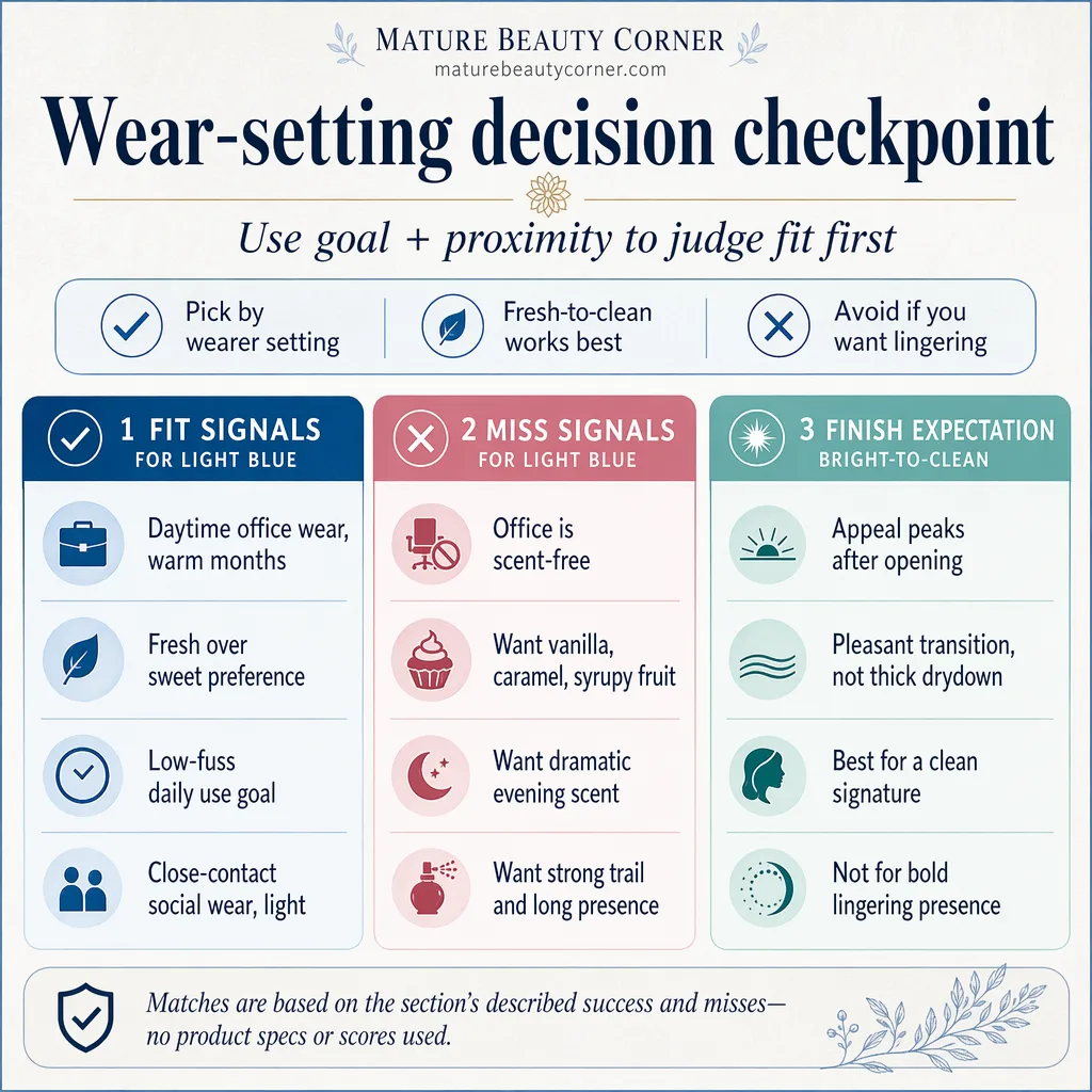 Using it for every occasion also creates regret. Light Blue fits daytime, mild weather, and easy social settings better than formal nights or heavy fabrics. One bottle does not need to do everything.