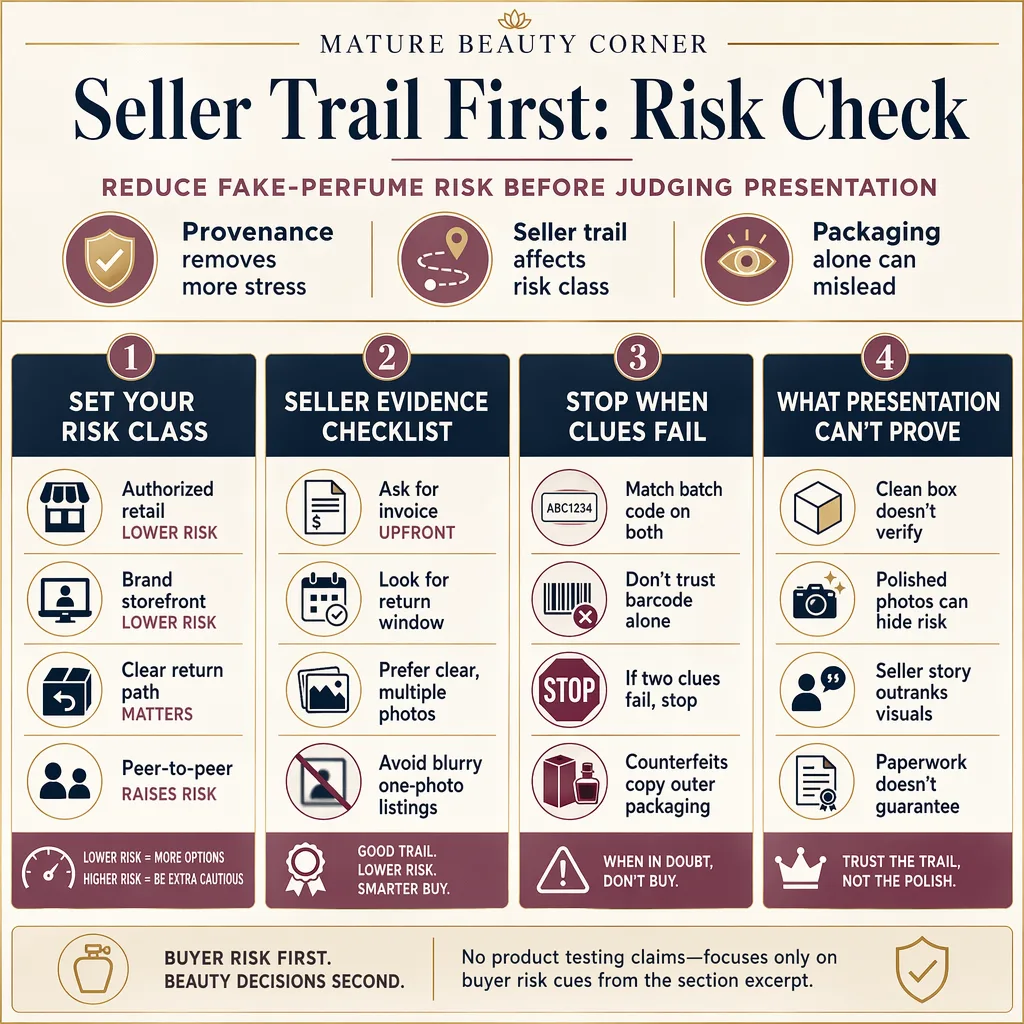 The seller trail matters before the scent does. Authorized retail, a brand storefront, or a seller with a clear return path sits in a different risk class from a peer-to-peer listing with no invoice and only one blurry photo.