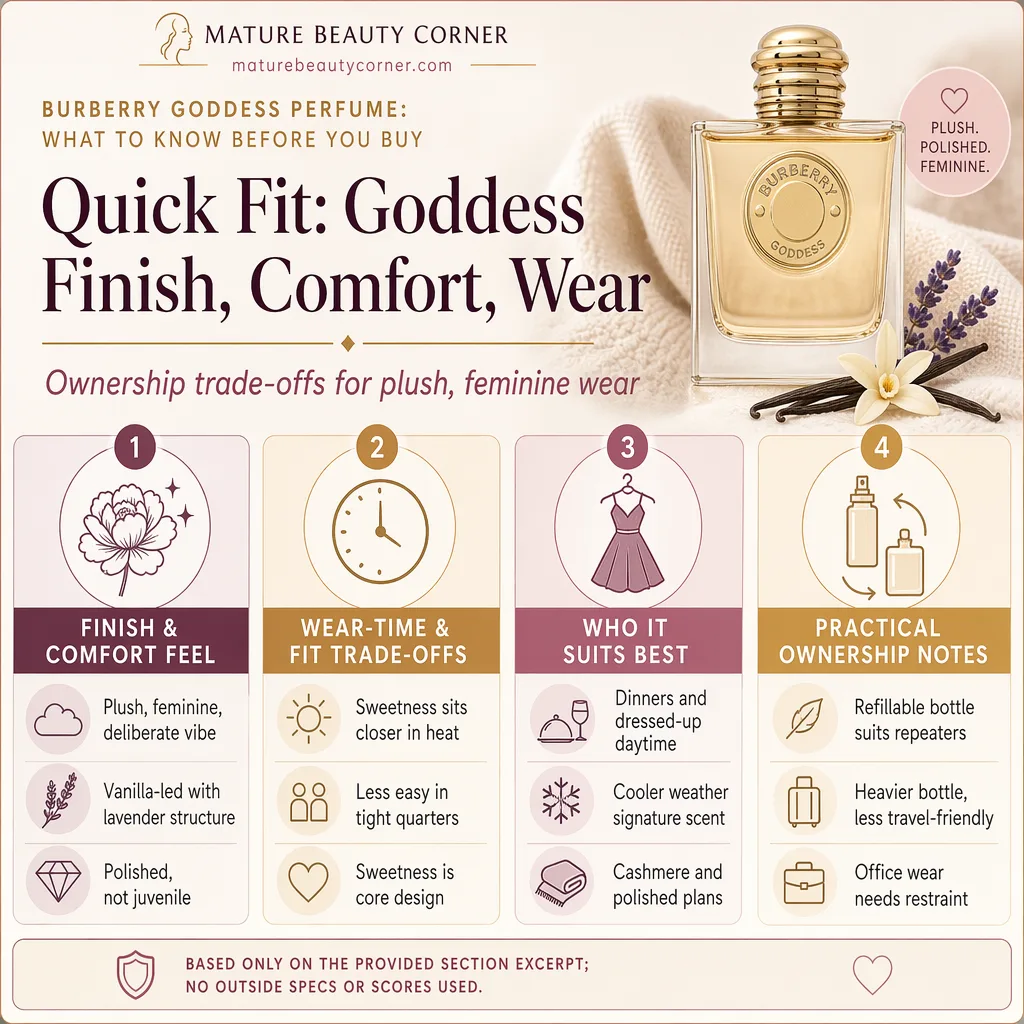 Burberry Goddess Perfume is a sensible buy for mature women who want a warm vanilla fragrance with enough lavender structure to stay polished. It stops being a smart choice if you want crisp citrus, a very quiet office scent, or a perfume that disappears into the background. The bottle also asks for commitment, because this is a fragrance to keep and refill, not one to toss into a travel pouch without thought.