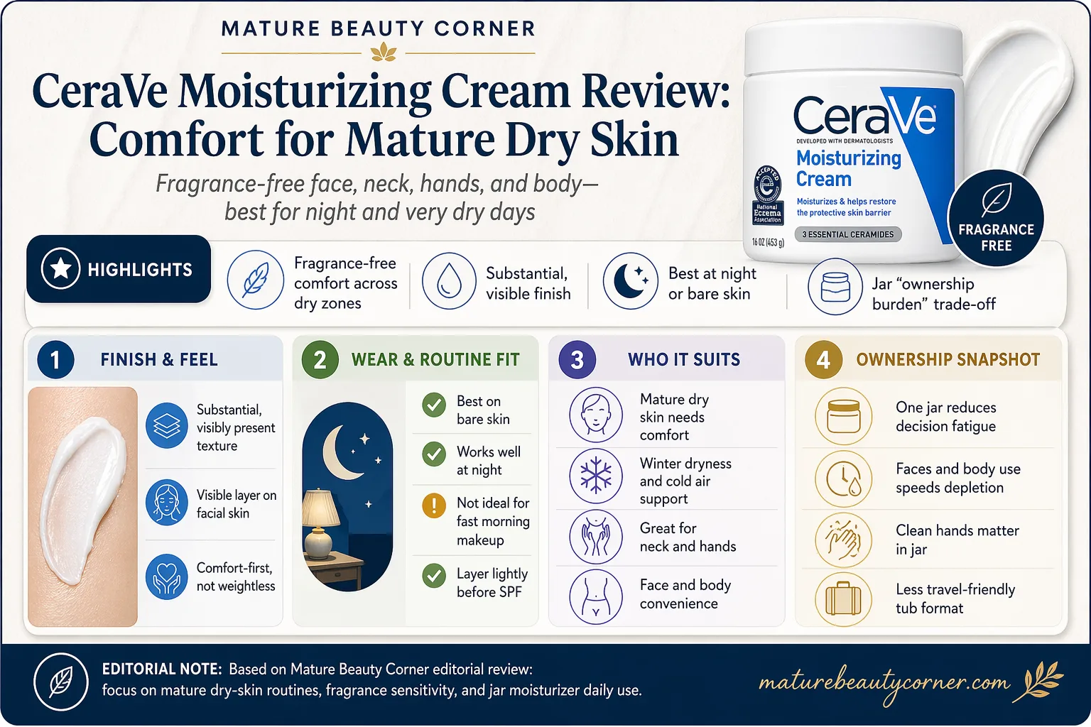 CeraVe Moisturizing Cream is not glamorous, and that is exactly why it works. Mature dry skin benefits from a cream that keeps showing up in the same places, on the same days, without asking for attention.