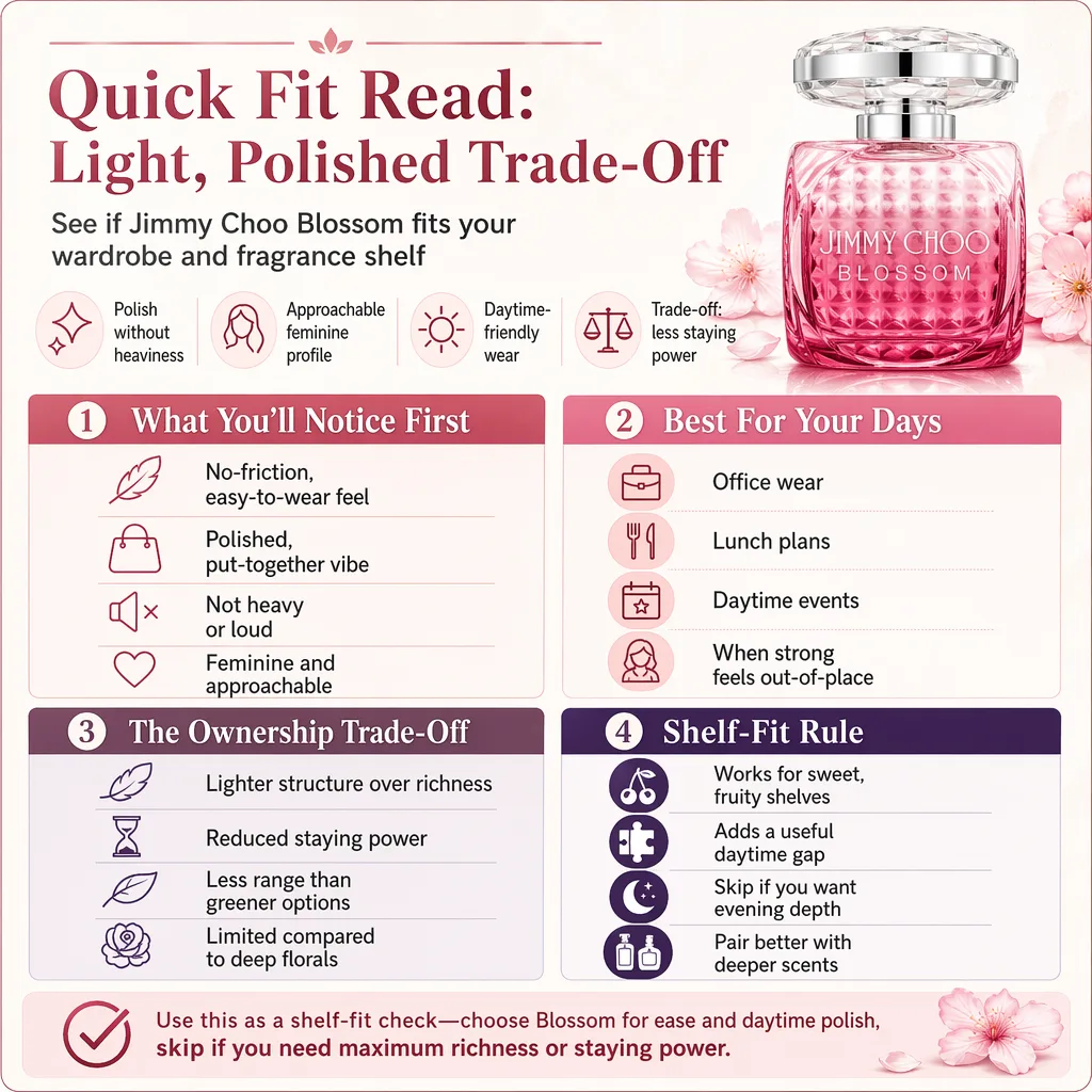Jimmy Choo Blossom Perfume is a sensible buy for women who want a bright, polished fruity floral that stays easy to wear in close company. For mature women who prefer neatness over drama, the balance works. The answer changes if you want strong projection or a darker evening scent, because Blossom keeps its profile light and straightforward rather than lush.