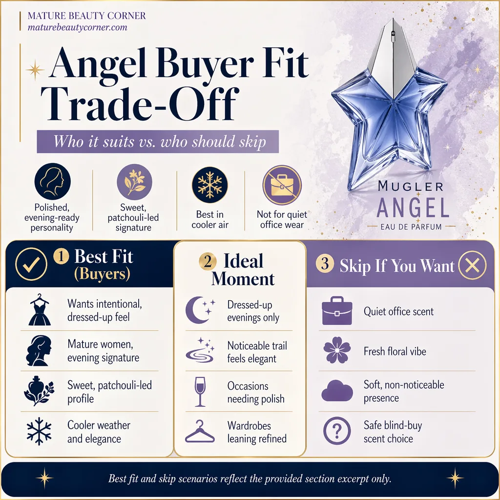 Mugler Angel earns a recommendation for shoppers who want a classic statement fragrance and already enjoy sweet gourmands with patchouli depth. It loses the recommendation if discretion, warm-weather comfort, or easy blind-buy safety matter more than character.