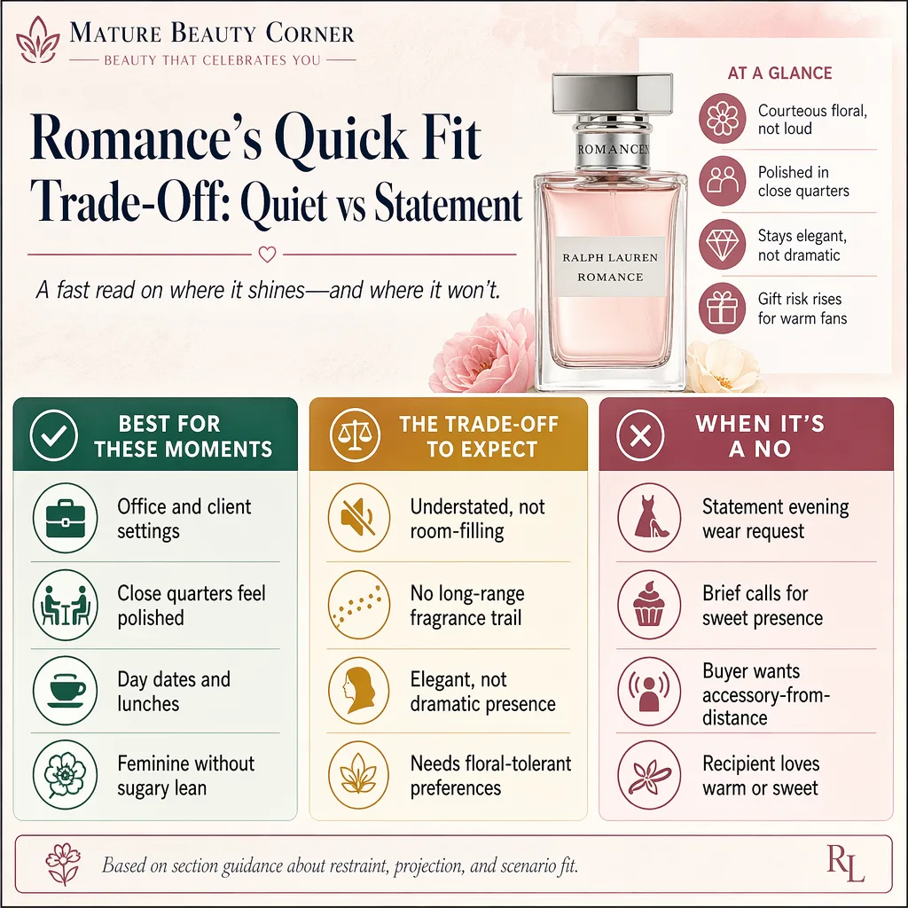 It stops being the right choice when the goal is strong projection, obvious sweetness, or a more dramatic evening scent. The fit changes again if the wearer prefers amber, vanilla, incense, or fruit-led perfume, because Romance sits in classic floral territory.