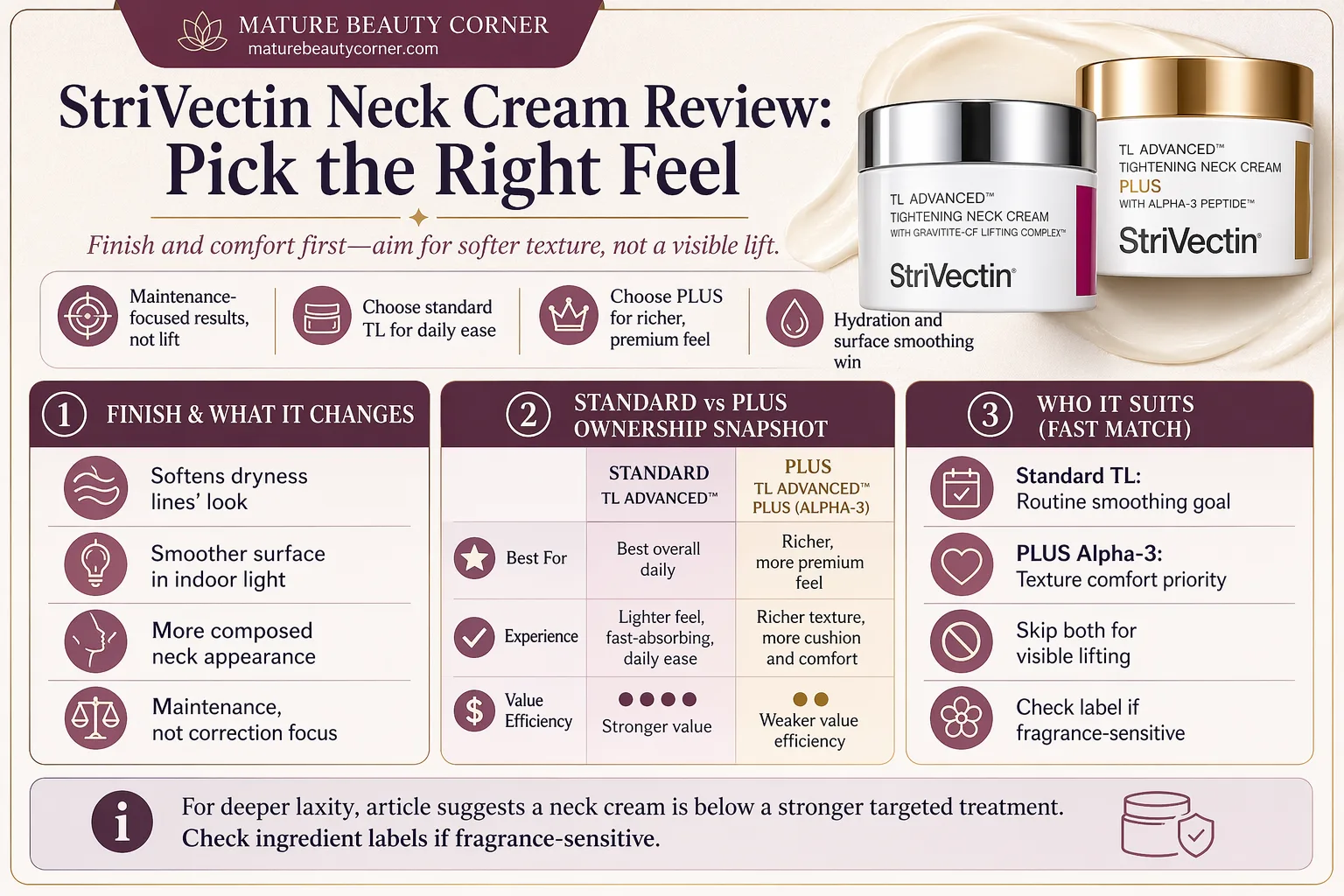 StriVectin neck cream delivers for mature skin when the goal is softer, better-hydrated neck texture rather than a visible lift, and the StriVectin TL Advanced Tightening Neck Cream is the cleaner starting point for most buyers. The StriVectin TL Advanced Tightening Neck Cream PLUS Alpha-3 Peptide earns attention only if a richer, more premium-feeling formula matters enough to justify weaker value. If deep laxity is the main concern, a neck cream sits below a stronger targeted treatment.