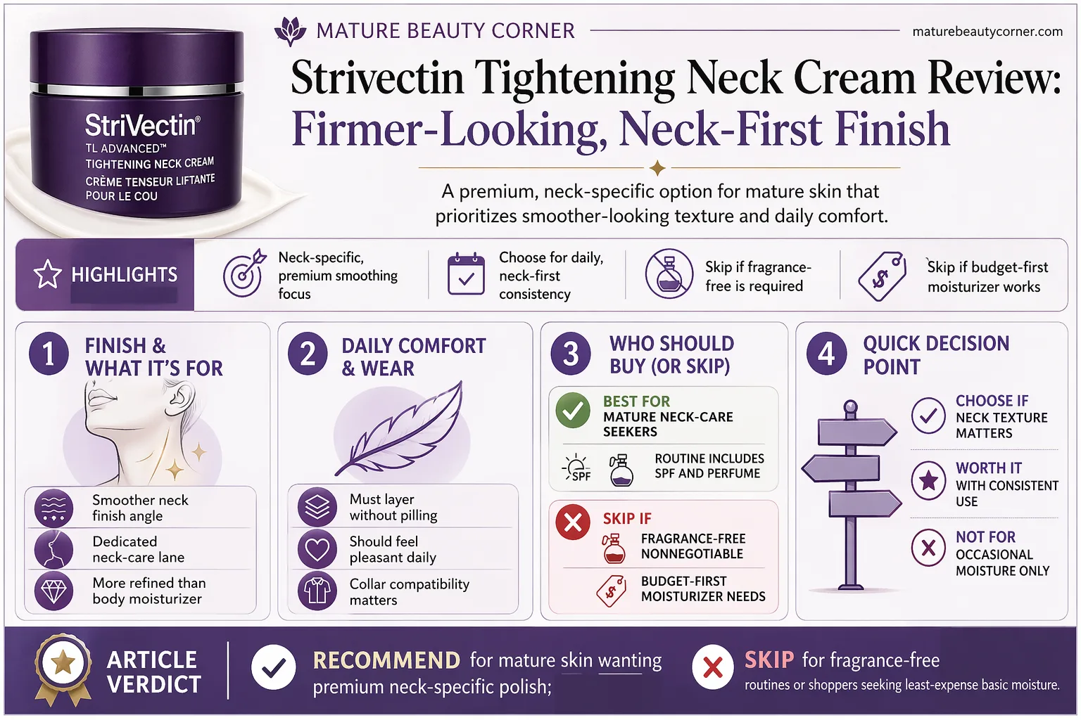 | Mature women who want a dedicated neck cream, a smoother-looking finish, and a routine that feels intentional. | Fragrance-free shoppers, minimalists, and anyone expecting a visible lift from a topical cream alone. |