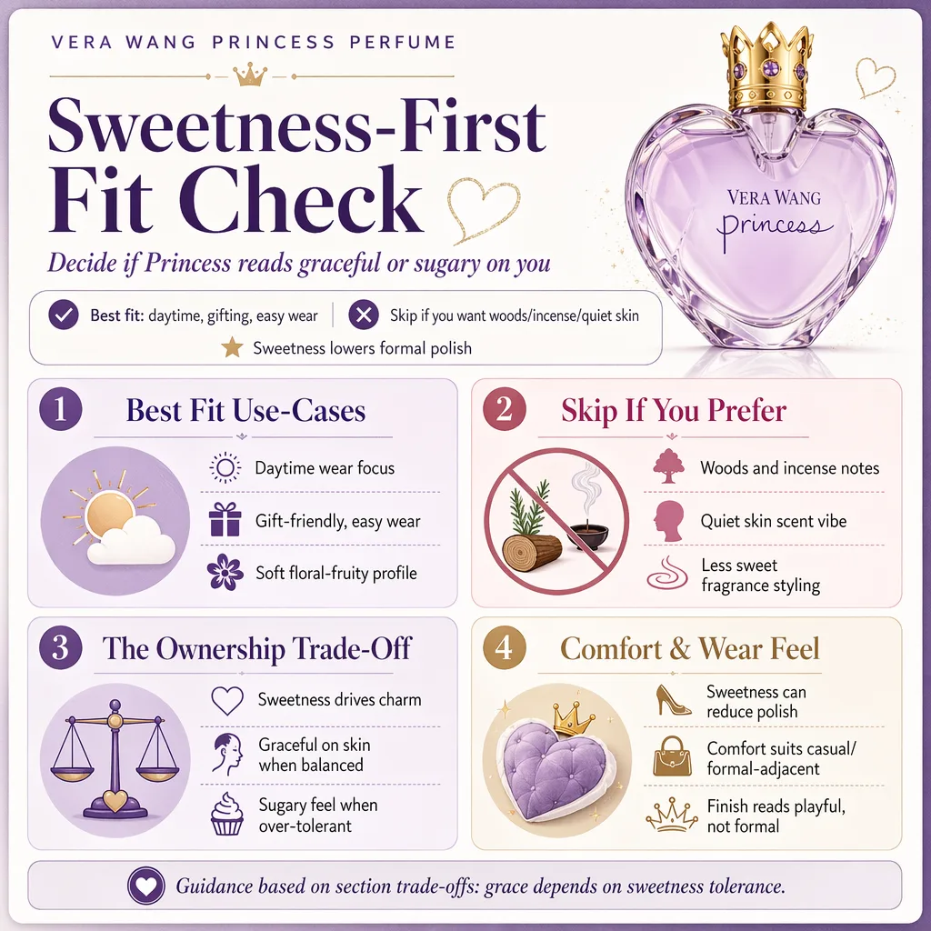 vera wang princess perfume is a sensible buy for women who want a sweet floral-fruity scent with an easy daytime personality. This Vera Wang Princess perfume review turns on sweetness tolerance, because the fragrance reads playful and decorative before it reads restrained. The fit changes fast if you prefer dry woods, incense, or a scent that disappears into the background. For mature women who still like a bright, feminine spray, it works best as a low-friction perfume for casual wear and social settings.